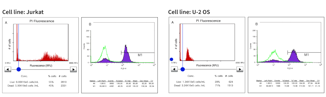 열 충격 세포는 PI로 염색했고 전체 세포 중 생균율은 다른 두 가지 유형의 세포인 Jurkat과 U-2 OS를 이용하여