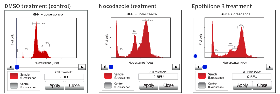 HeLa 세포는 G2/M단계에서 세포를 arrest하기 위해 Nocodazole (Microtubule-Destabilizer) 또는 Epothilone B (Microtubule-Stabilizer)로 처리되었습니다. 세포는 70% 에탄올과 Fix되었고 PI로 염색되었습니다.