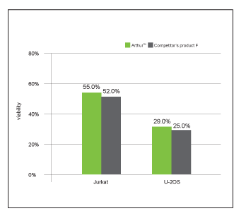 각각의 세포 라인에서 Arthur™의 생존율 결과는 경쟁사 제품 F의 결과와 일치합니다.