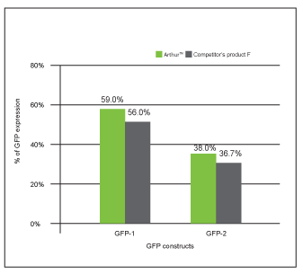 Arthur™에서 검출된 GFP 발현이 된 세포의 퍼센트는 경쟁사 제품 F와 일치합니다.