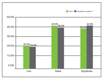 (Following 18 hour-treatment of Staurosporine, HeLa cells were stained with apoptosis kit and subjected to Arthur™ and competitor's product F). Apoptosis Kit는 Live (Annexin V-negative/PI-negative), Dead (PI-positive), Apoptotic (Annexin V-positive/PI-negative)