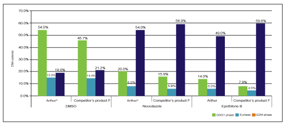 Arthur™와 경쟁사 제품 F의 세포 주기 프로필 비교