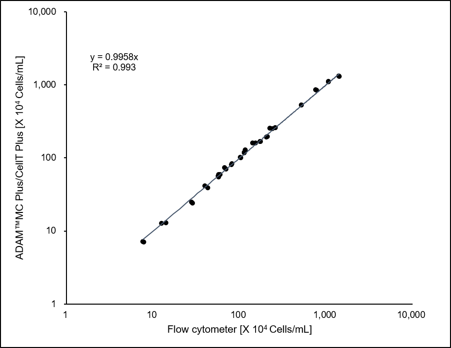 Data were compared between flow cytometer and ADAM™ MC Plus & CellT Plus results in 20 different PBMC concentration sample. |