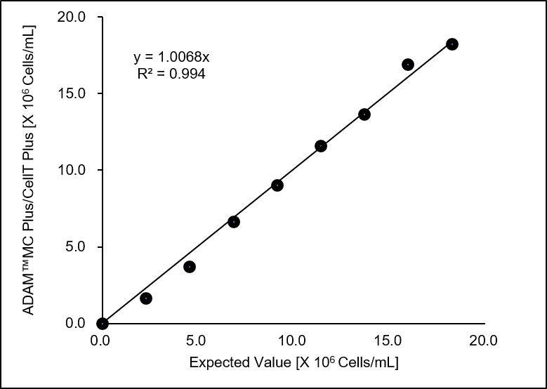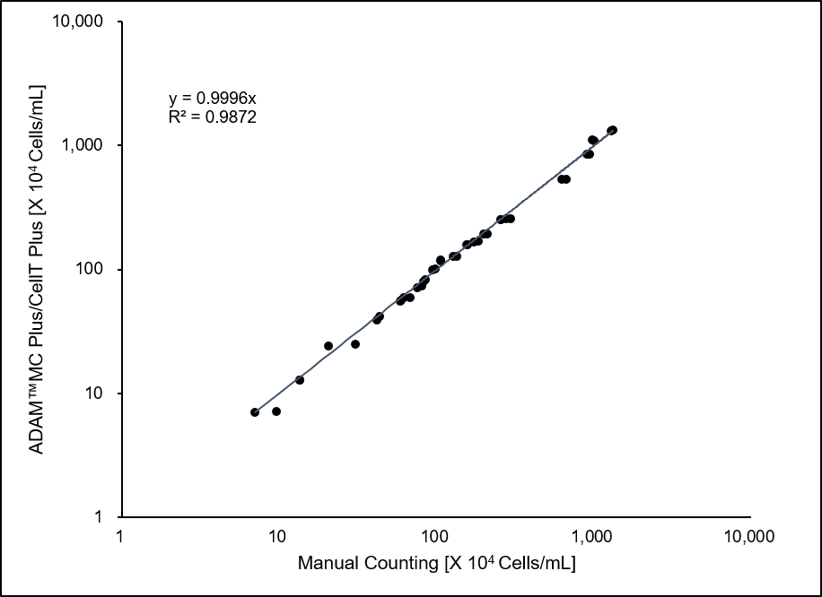 | Data were compared between manual count and ADAM™ MC Plus & cellT Plus results in 20 different PBMC concentration samples. |
