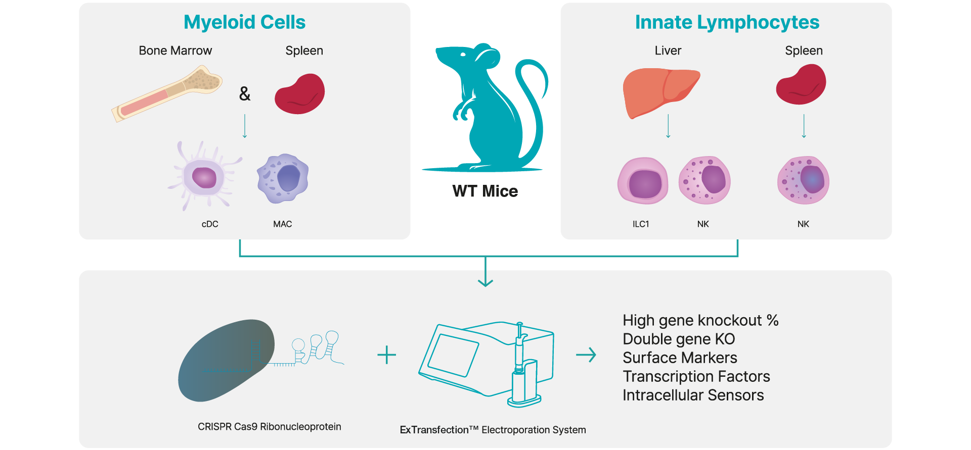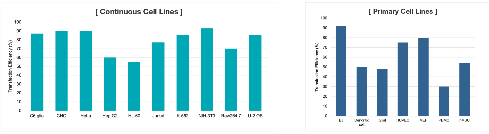 ExTransfection™ is a highly efficient tool for gene editing, achieving a high gene knockout percentage and enabling important analyses such as double gene knockout, surface markers, transcription factors, and intracellular sensors.
