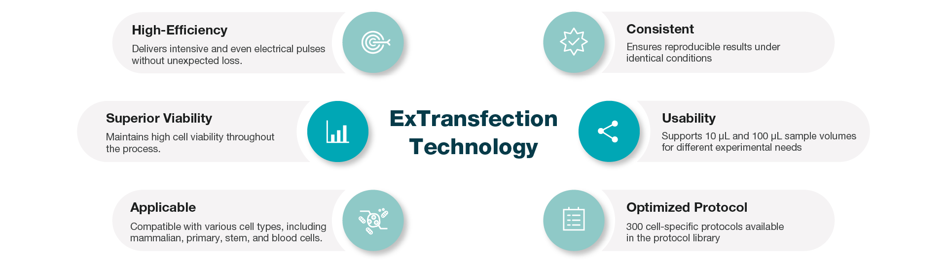 ExTransfection™ provides open protocols that make it easy for users to set up and run experiments. Its 24-well optimization method helps users to optimize transfection protocols easily and quickly.
