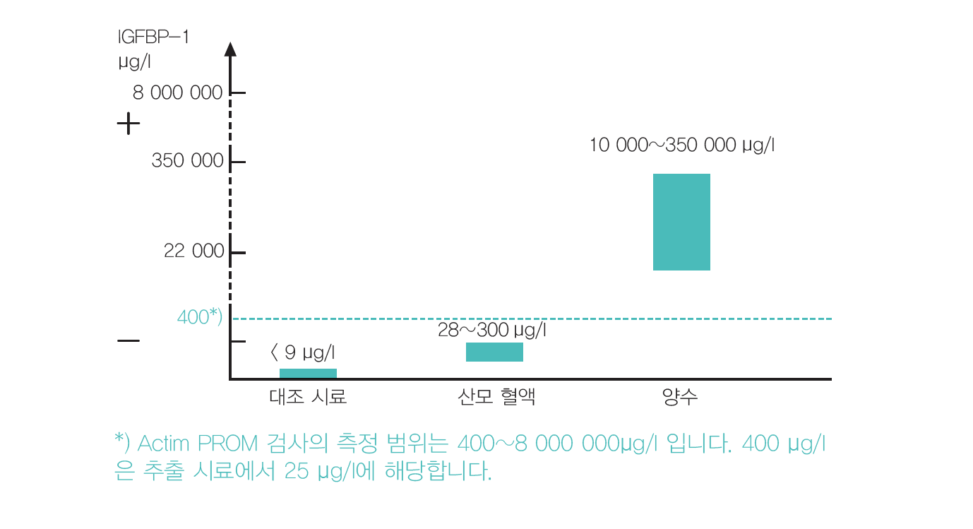 Actim PROM의 감별 범위는 400~8,000,000 μg/l로, 가장 작은 미세 파열에서부터 가장 심각한 파열까지 임상적으로 관련성이 있는 모든 범위를 검출할 수 있습니다. 이 검사는 양수에만 특이성을 갖도록 고안되어서, 쉽게 진단할 수 없는 환자에게서도 올바른 결과를 얻을 수 있습니다.
