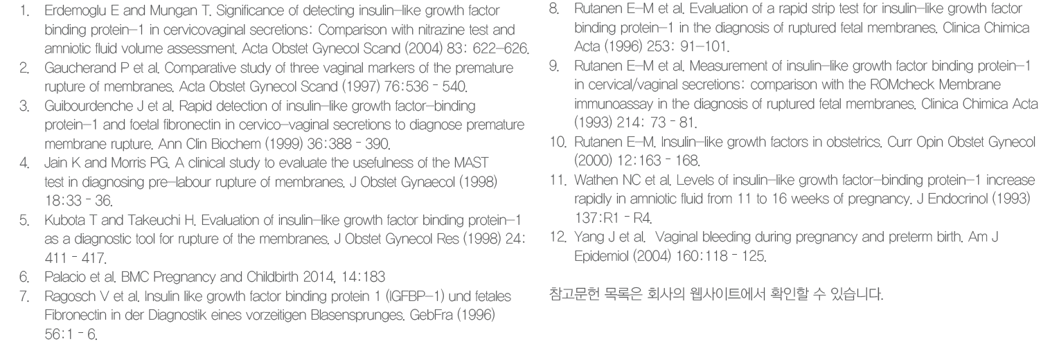 Actim PROM은 모든 환자에게서 양막의 조기 파열(PROM)을 쉽고 빠르게 검출하기 위한 신뢰성 있는 검사입니다. 양막 파열은 조기 분만을 가장 일반적으로 식별할 수 있으며, 산모와 태아의 질병과 관련된 주요 원인이기도 합니다. 정확한 PROM 진단은 올바른 치료와 합병증을 최소화하는데 중요합니다. 그러나 PROM 증상은 환자마다 다르므로 진단을 내리는 것이 어렵습니다.