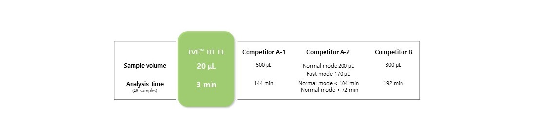EVE™ HT FL은 소중한 샘플 중 단 20 μL만을 사용합니다.